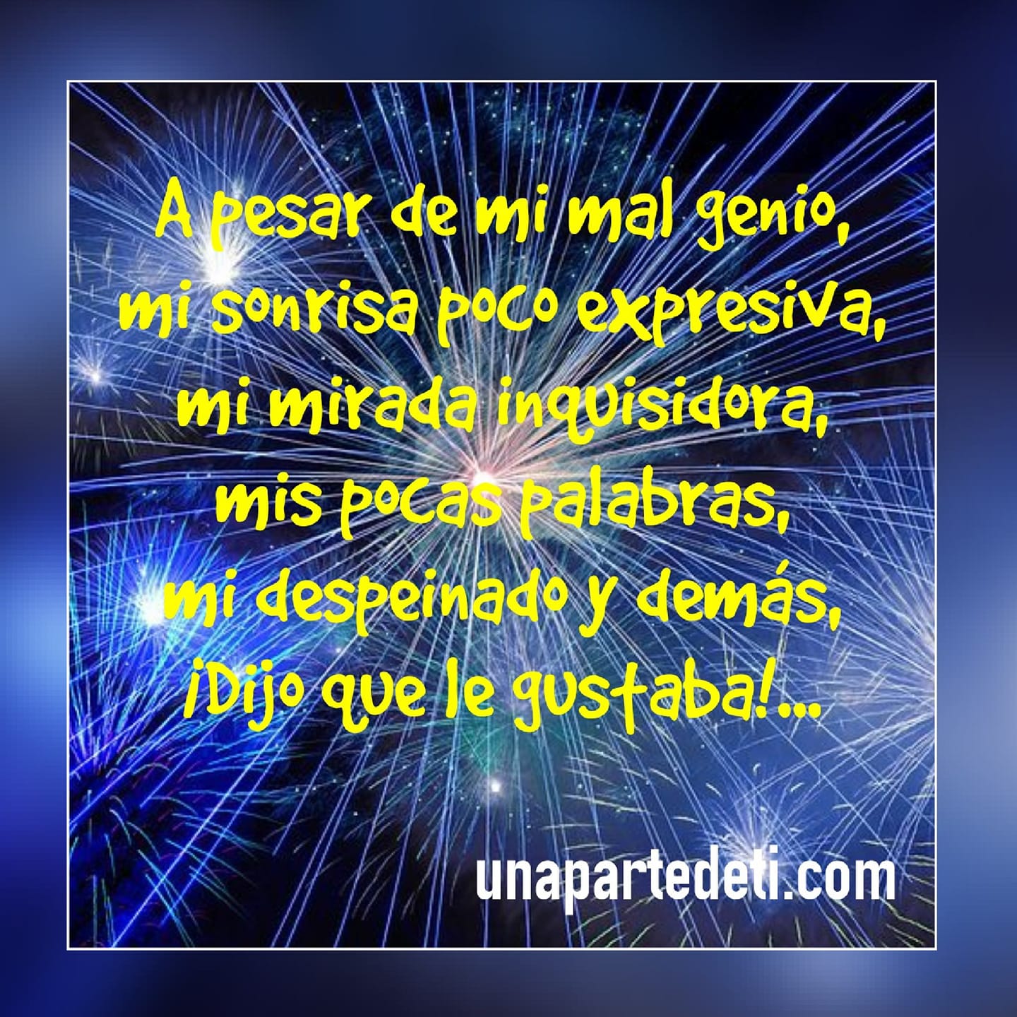 A pesar de mi mal genio, mi sonrisa poco expresiva, mi mirada inquisidora, mis pocas palabras, mi despeida y demás, ¡dijo que le gustaba!.... UnaParteDeTi ¡Eso dijo!.... Scroll infinito con AJAX y PHP Cargar más...
