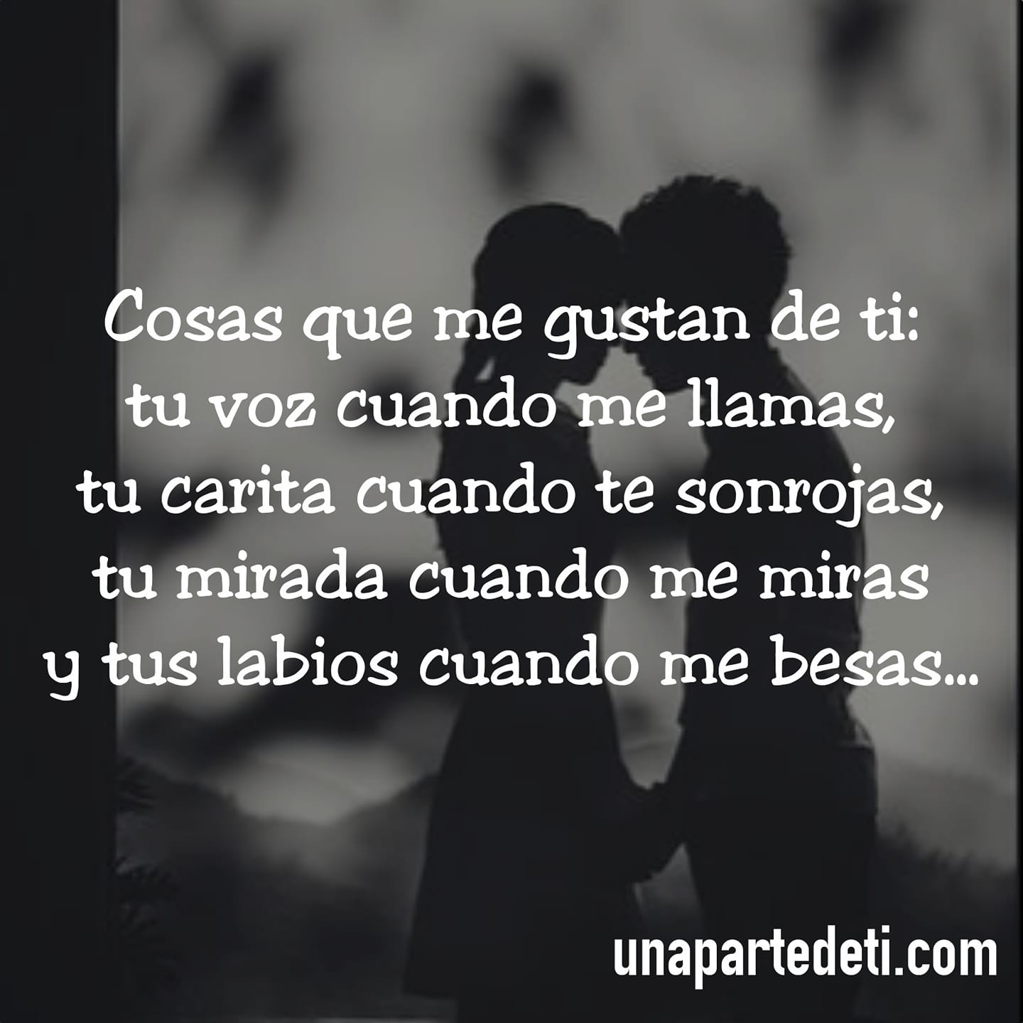 Cosas que me gustan de ti: tu voz, tu carita, tu mirada y tus labios.... Una Parte de Ti Cosas que me gustan de ti: tu voz cuando me llamas, tu carita cuando te sonrojas, tu mirada cuando me miras y tus labios cuando me besas. Scroll infinito con AJAX y PHP Cargar más...