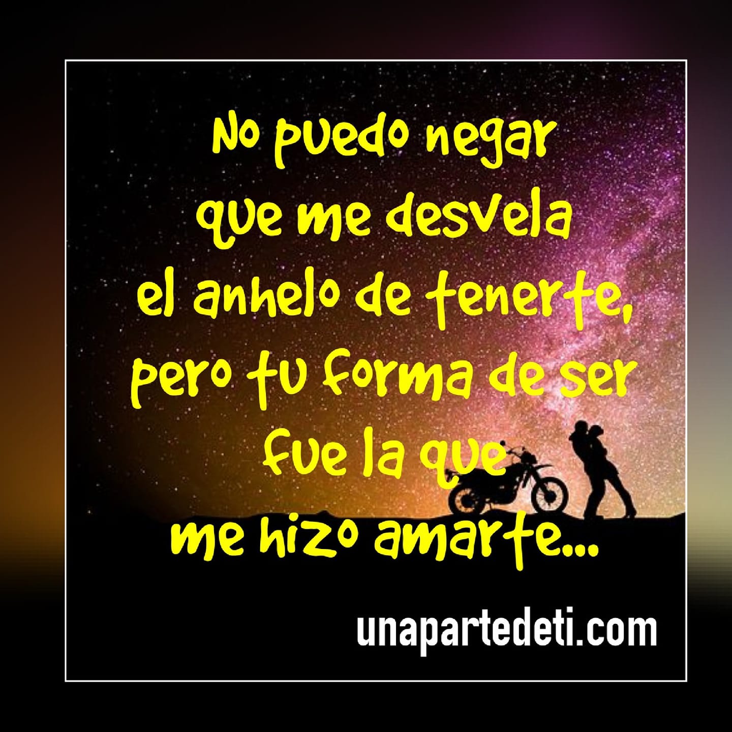 No puedo negar que me desvela el anhelo de tenerte, pero tu forma de ser fue la que me hizo amarte.... UnaParteDeTi Estás en mis pensamientos desde que tú llegaste a mi vida y ahora te hago frases de sueños de amor, magia y deseo. Scroll infinito con AJAX y PHP Cargar más...